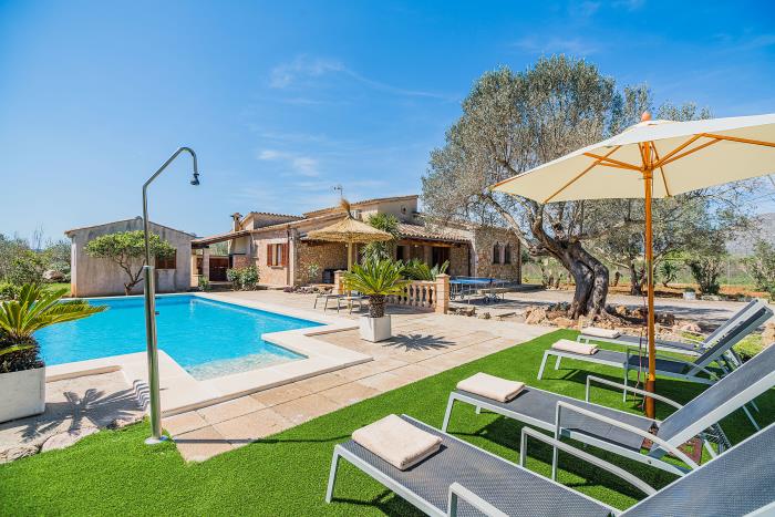 Von der Terrasse blicken Sie auf den großen Pool und in den schön angelegten Garten mit vielen alten mediterranen Sträuchern und Bäumen. Viele Blumentöpfe und bepflanzte Tröge lockern den Garten auf und zeugen von der liebevollen Pflege durch die mallorquinischen Eigentümer. Dieser kommt regelmäßig zur Pflege seines Gatens auf dem Fincagelände und auch zur Pflege des Pools. Er ist bei Fragen und Wünschen immer ansprechbar.